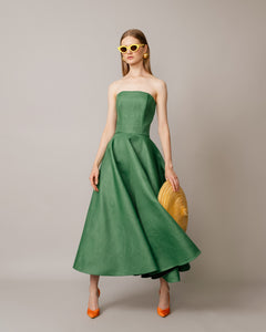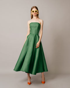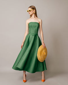 Strapless raffia emerald dress with straight neckline bustier with full skirt and back zip fastening.