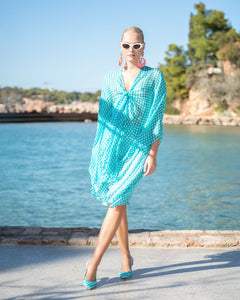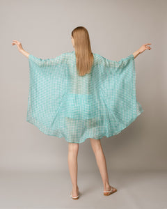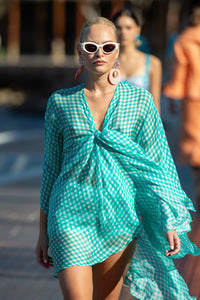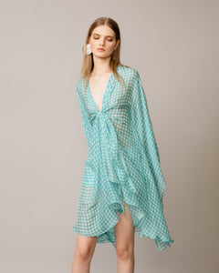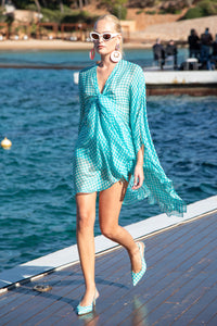 One size mini assymmetric caftan/dress with deep V neckline and front knot fastening. This garment is sea through and has no lining.