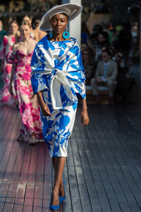 Fully lined midi pencil dress in stripes with a round neckline and invisible back zip fastening.