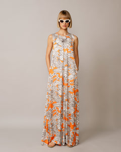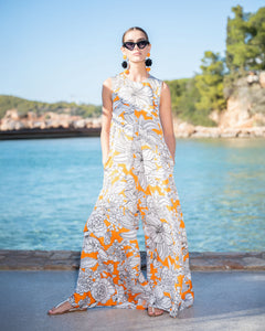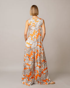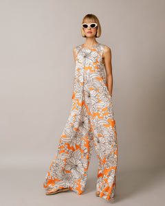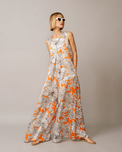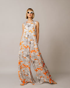 Maxi wide sleevless jumpsuit in floral viscose fabric. Featuring inverted pleat at the front, closed back with invisible back zip fastening.